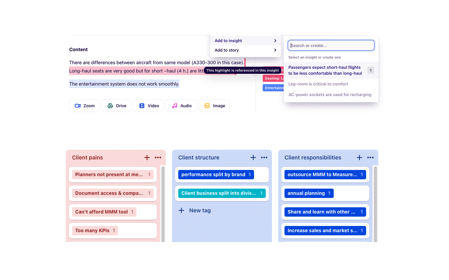 Coding qualitative research is really time consuming, and can get messy. A repository unlocks a way to systematically and consistently apply tags and group them into themes so the overall insights become clear. There’s work to be done to decide on a tagging taxonomy, but this can evolve over time, and once tags have been created, it’s very quick to find key moments in video transcriptions and apply the same tags to them.